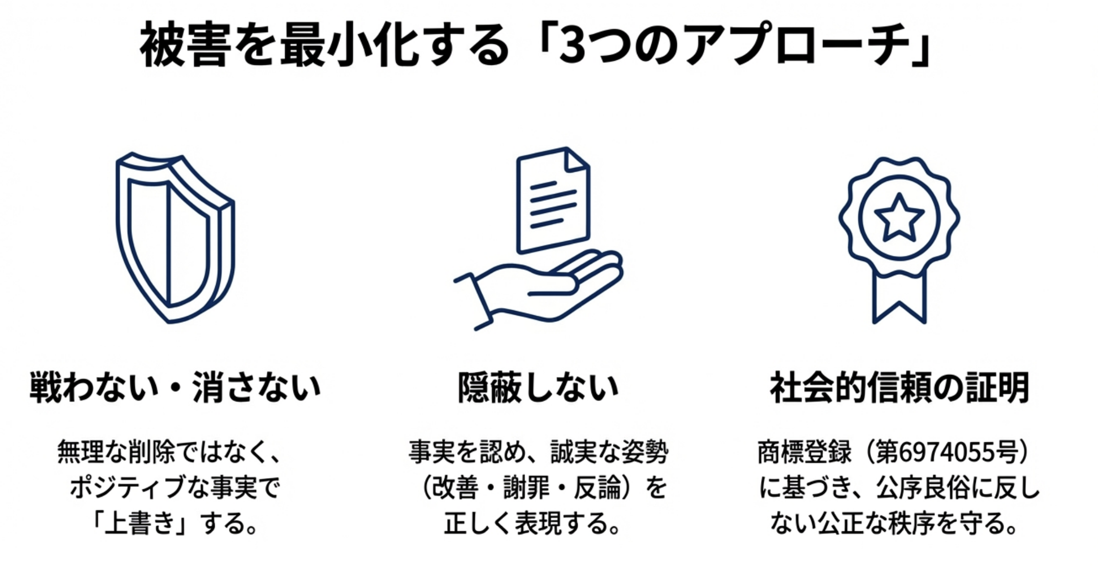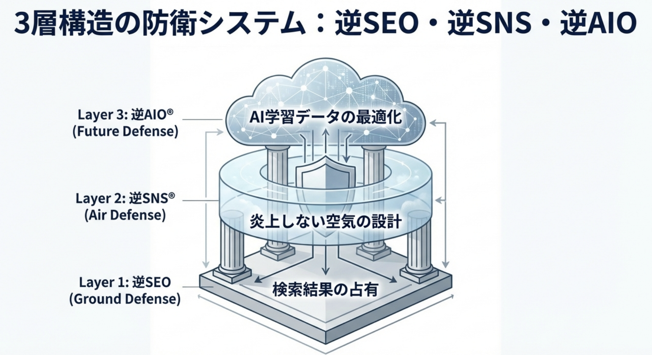 逆SEO(ブランディングSEO)・逆SNS(商標登録済み)・逆AIO(商標登録済み)スパム工作に頼らず、検索・SNS・AIを横断して信頼を上書きします。